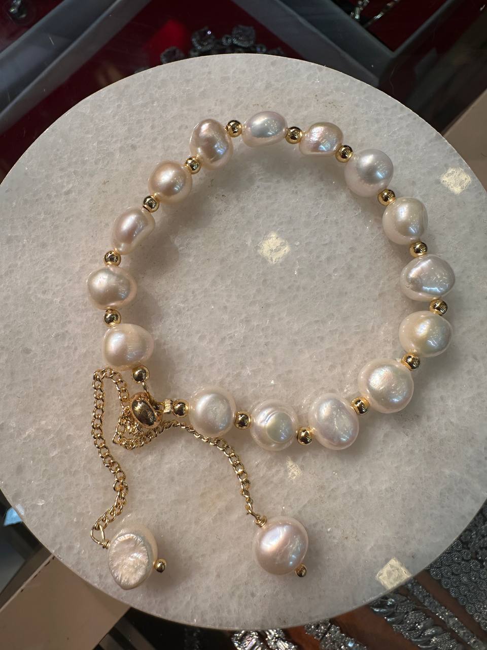 Gold Renk Rodyum Kaplama İnci Kalp Taşlı Lastik Misina Bileklik Genişlik 5 cm.